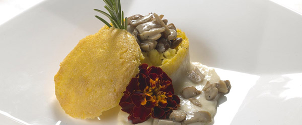 Flan di polentina ripieno di funghi su fonduta al Taleggio D.O.P.