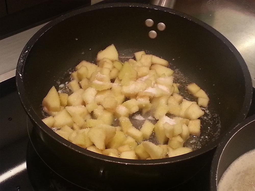 Tagliare la mela a cubetti (mantenendo la buccia) e cuocerla in una padella, con 20 gr di burro e lo zucchero, fino a quando non si sarà ammorbidita.