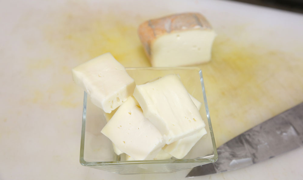 Per preparare i paccheri con fonduta di Taleggio D.O.P. e indivia, tagliare il Taleggio D.O.P. a pezzi grossolani e farlo scogliere a bagnomaria.