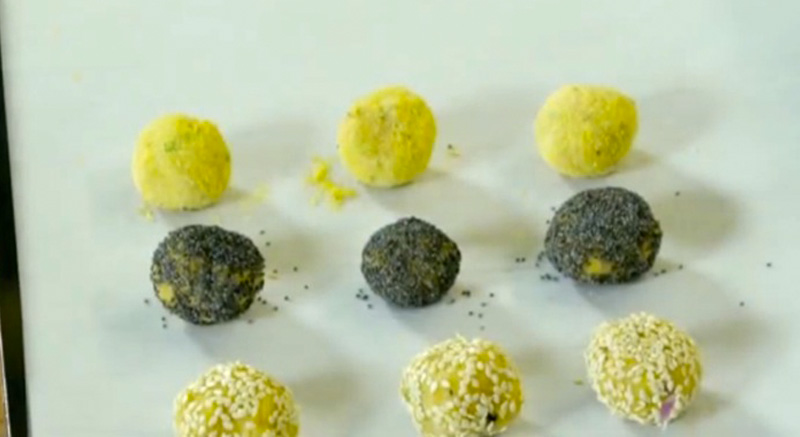 Dopo aver formato 30 polpette, passarne alcune nei semi di sesamo, altre nei semi di papavero e altre ancora nella farina gialla di polenta. Cuocerle in forno per 10 minuti a 160°/170°.
