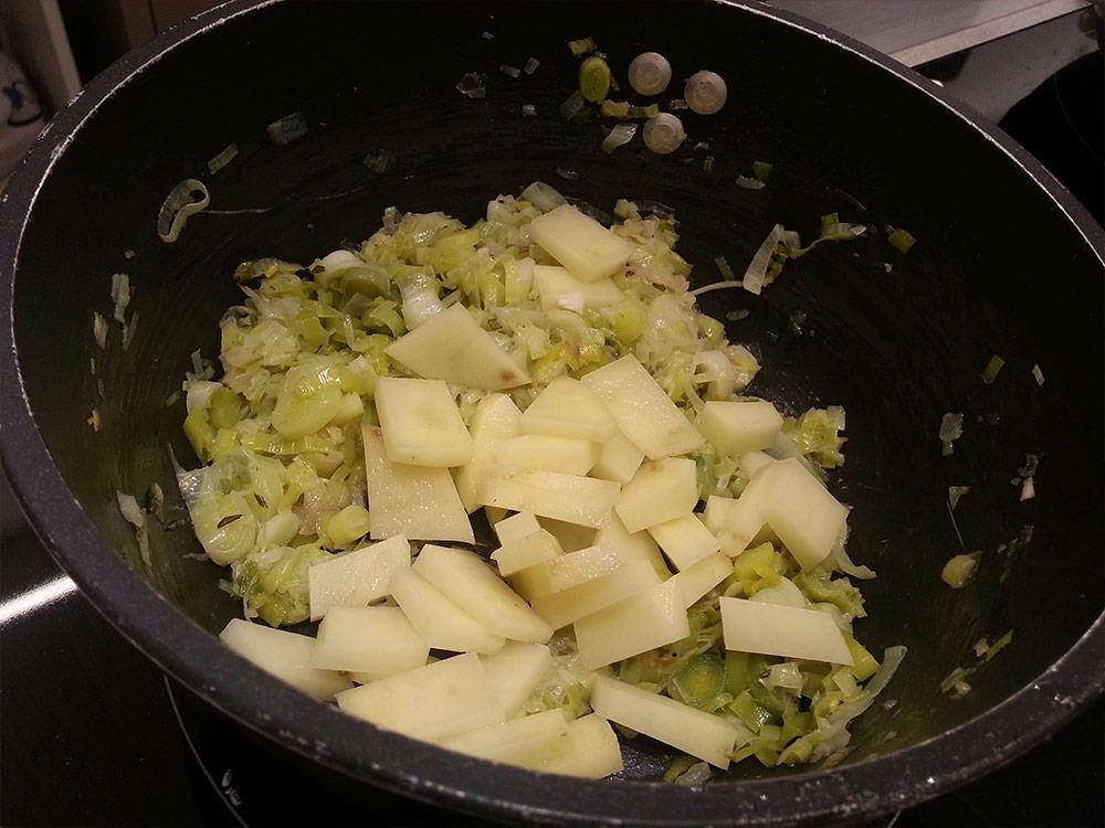 Sbucciare le patate e tagliarle a tocchetti, tritare uno scalogno e il rosmarino. Pulire i porri e tagliarli a rondelle.